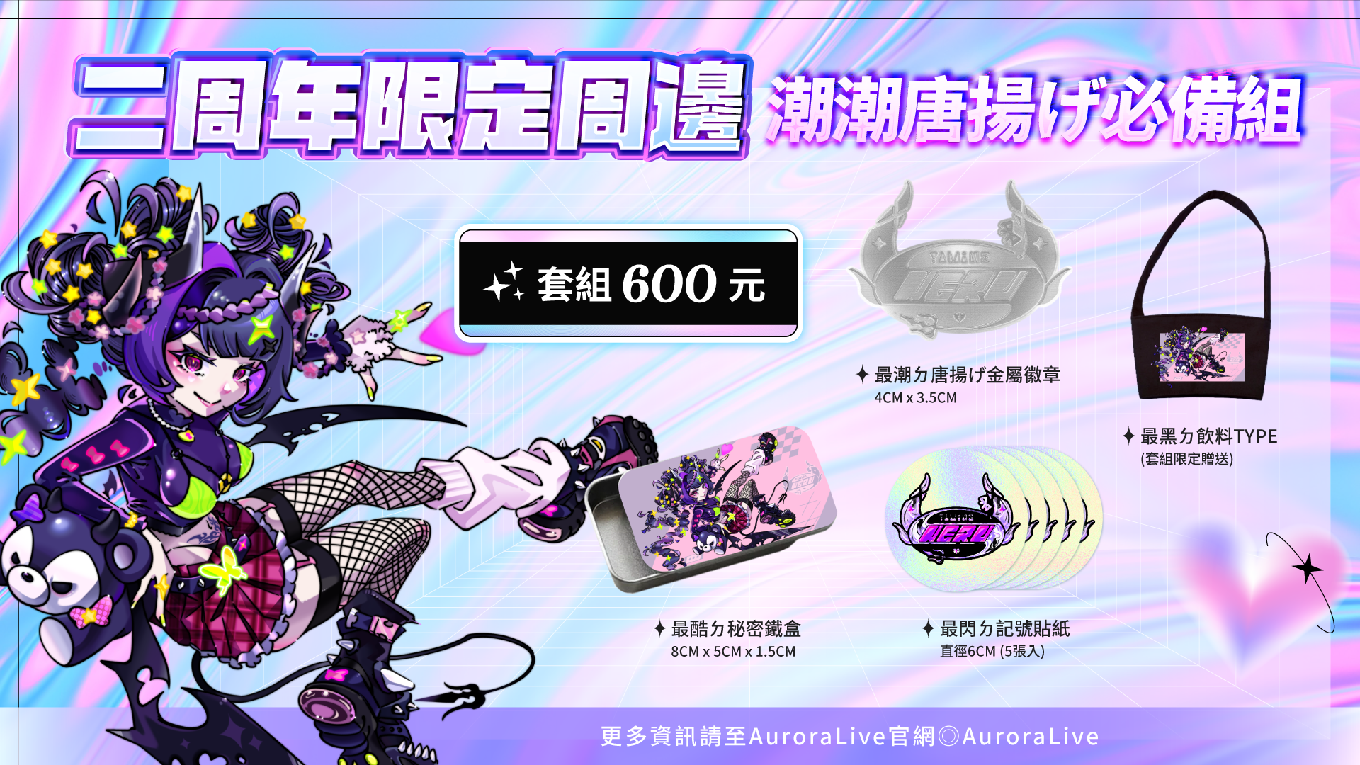 ✨-AuroraLive販賣部-✨ 今年給大家又暖又潮的大禮包啦🎁 刷毛帽T、飲料提袋、小鐵盒、金屬徽章、閃閃貼紙缺一不可😈 今年冬天就讓ネル陪你過吧💜 📅週邊預購時間:11/19-12/10 ㊙️帽T僅限套組販售,錯過不再!㊙️ 🎉-周年限定周邊一覽-🎉 😈ネル 2周年限定周邊 - 最暖最潮大禮包 2100 元 💜最暖ㄉ刷毛毛帽T期間限定預購,錯過不再 💜飲料杯套為套組限定,不單賣 😈ネル 2周年限定周邊 - 潮潮唐揚げ必備組 600元 💜飲料杯套為套組限定,不單賣 😈ネル 2周年限定周邊 - 8CM x 5CM x 1.5CM 最酷ㄉ秘密鐵盒 150 元 😈ネル 2周年限定周邊 - 4CM x 3.5CM 最潮ㄉ唐揚げ金屬徽章 280 元 😈ネル 2周年限定周邊 - 直徑6CM 最閃ㄉ記號貼紙(5張入) 50 元
